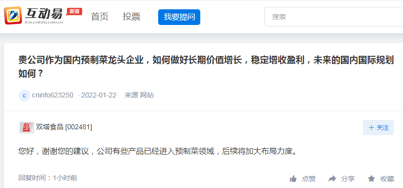 上证报中国证券网讯 双塔食品1月25日在互动平台回答投资者提问时表示,公司有些产品已经进入预制菜领域,后续将加大布局力度。