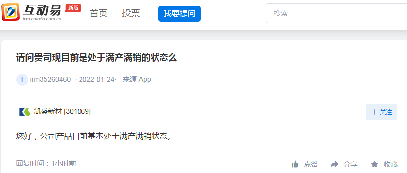 上证报中国证券网讯 凯盛新材1月26日在互动平台回答投资者提问时表示,公司产品目前基本处于满产满销状态。