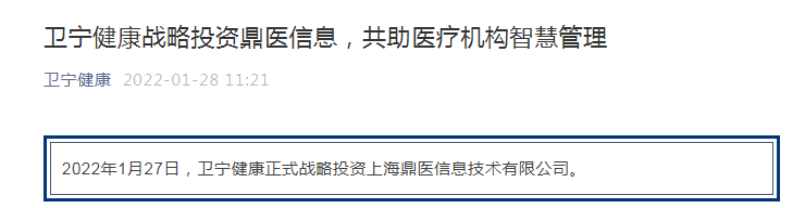 上证报中国证券网讯 据卫宁健康1月28日消息,1月27日,卫宁健康正式战略投资上海鼎医信息技术有限公司。