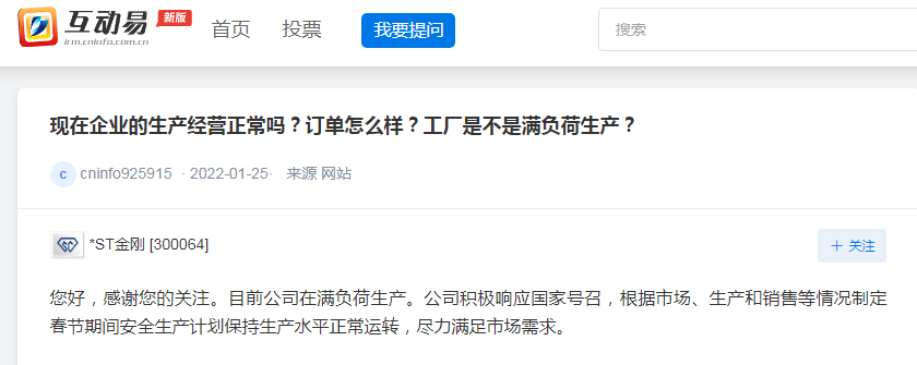 *ST金刚:目前公司在满负荷生产