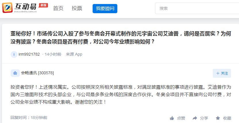 上证报中国证券网讯 会畅通讯2月7日在互动平台回答投资者提问时表示,公司入股了参与冬奥会开幕式制作的公司艾迪普。艾迪普作为国内三维图形技术的头部企业,与公司是多条业务线的深度合作伙伴。冬奥会项目并不直接向公司付费,对公司全年业绩不构成重大影响。