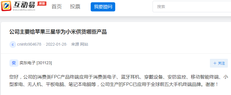 奕东电子:公司生产的FPC已应用于全球前五大手机终端品牌