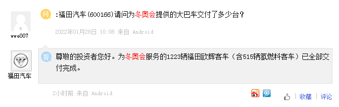 上证报中国证券网讯 福田汽车2月7日在互动平台回答投资者提问时表示,为冬奥会服务的1223辆福田欧辉客车(含515辆氢燃料客车)已全部交付完成。