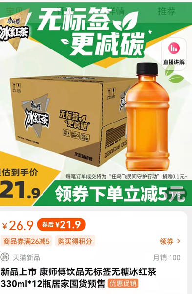 据康师傅介绍,无标签产品指瓶装产品去除瓶标,产品整箱售卖标签信息已在纸箱完整标示。PET瓶回收无需再分离标签,裸瓶便于回收再利用,而且单瓶无标签整箱销售及纸箱减少油墨的使用比同规格常规产品减少碳排放量。