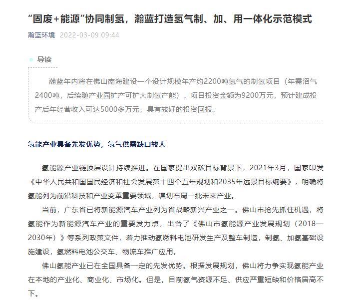 瀚蓝环境:年内拟在佛山南海投建制氢项目 设计规模年产约2200吨