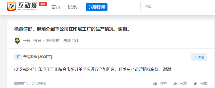 开润股份:印尼工厂正进行产能扩建 目前生产运营情况良好