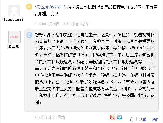 凌云光:公司产品和技术已广泛服务于宁德时代等行业龙头公司产业链