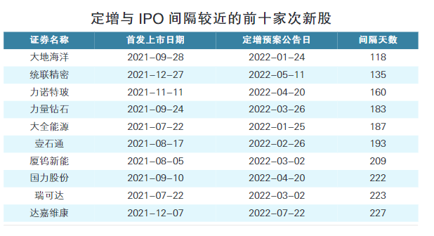 比较典型的是大地海洋,公司于2021年9月28日登陆创业板,2022年1月24日便发布了定增预案,相隔仅118天。又如科创板公司统联精密,公司于2021年12月27日上市,2022年5月11日,公司发布了定增计划,相隔也仅135天。
