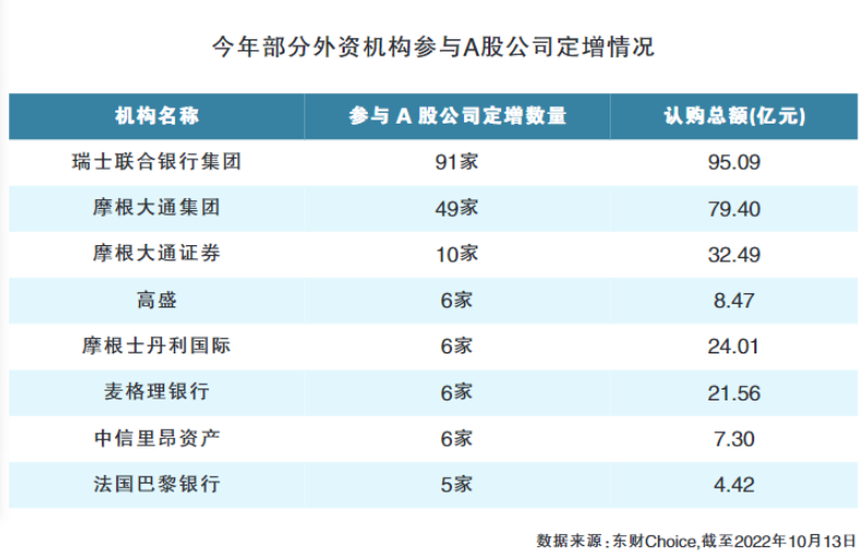 据记者梳理,与上年同期相比,今年以来外资机构参与A股定增的热情进一步提升,瑞士联合银行集团、摩根大通集团、中信里昂资管等机构认购定增的次数和认购总额,均较上年同期有所增长。