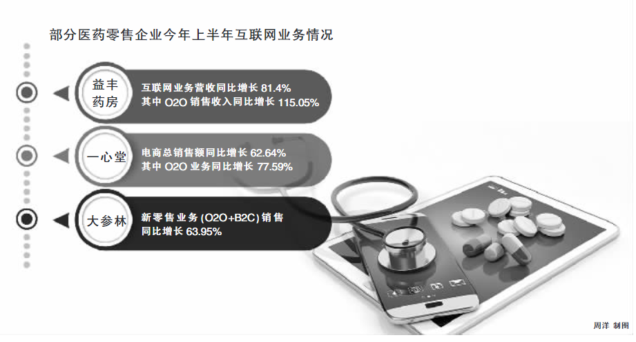 从多家医药零售企业财报数据可以看出其互联网业务的布局及增长势头。2022年上半年,益丰药房互联网业务营收同比增长81.4%,其中O2O销售收入同比增长115.05%;一心堂电商总销售额同比增长62.64%,其中O2O业务同比增长77.59%,已实现与线下门店同步融合;大参林O2O送药服务已覆盖7639家门店,新零售业务(O2O+B2C)销售同比增长63.95%。