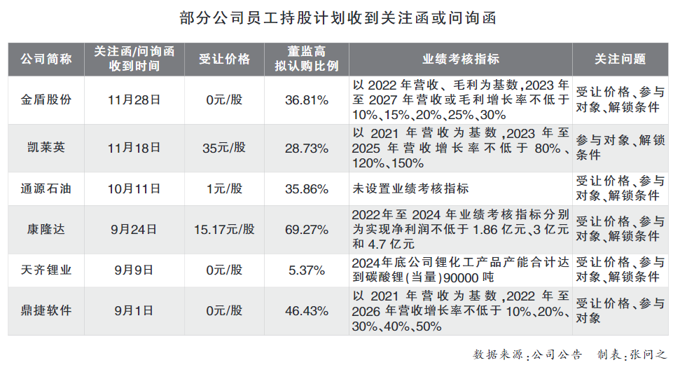 近日,金盾股份收到深交所关注函,追问其“0元购”员工持股计划是否存在变相利益输送的情形。上海证券报记者注意到,近期,凯莱英、康隆达、通源石油、天齐锂业、鼎捷软件等多家A股公司员工持股计划收到交易所关注函或问询函。