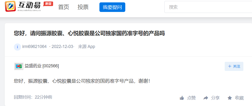 益盛药业:振源胶囊、心悦胶囊是公司独家的国药准字号产品