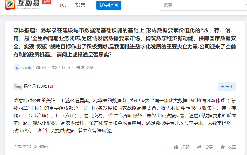 上证报中国证券网讯 易华录21日在互动平台上回答投资者提问时表示,易华录的数据湖业务已成为全国一体化大数据中心协同创新体系(“东数西算”工程)的重要组成部分。公司业务发展和国家战略高度契合,提供数据要素“收(收集)、存(存储)、治(治理)、用(应用)、易(交易)”全生命周期服务,最终走向数据交易。通过对数据要素的低成本汇聚、规范化确权、高效率治理、资产化交易和全场景应用,满足数据要素开放共享要求,为数字经济、数字政府、数字社会提供数据、算力和算法赋能。