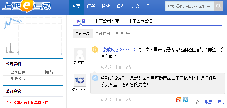 上证报中国证券网讯 豪能股份1月6日在互动平台上回答投资者提问时表示,公司差速器产品目前有配套比亚迪“仰望”系列车型。