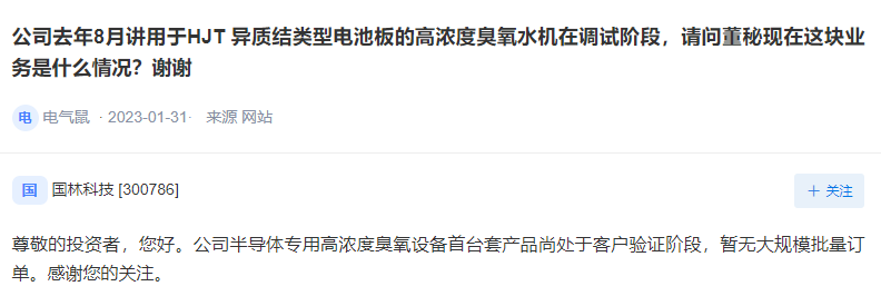 国林科技:公司半导体专用高浓度臭氧设备首台套产品尚处于客户验证阶段
