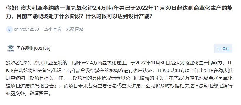 天齐锂业:子公司TLK正陆续将相关氢氧化锂产品样品分发给潜在承购方进行客户认证