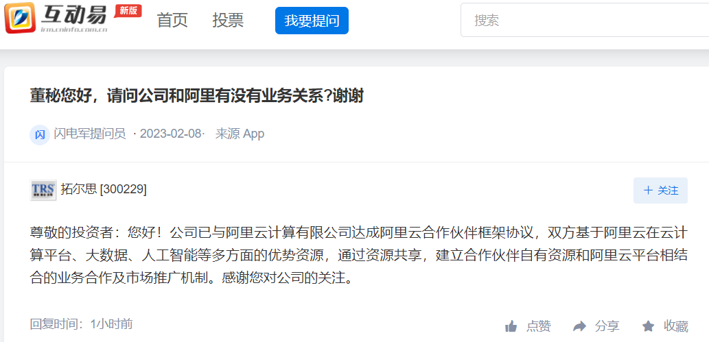 上证报中国证券网讯 拓尔思13日在互动平台上回答投资者提问时表示,公司已与阿里云计算有限公司达成阿里云合作伙伴框架协议,双方基于阿里云在云计算平台、大数据、人工智能等多方面的优势资源,通过资源共享,建立合作伙伴自有资源和阿里云平台相结合的业务合作及市场推广机制。2022年8月,公司与腾讯云计算(北京)有限责任公司签署战略合作协议。双方将发挥各自在云计算、大数据、人工智能和行业服务的能力优势,在多领域产业数据增值运营服务、多领域产业数据智能场景应用、多领域产业Web3.0技术探索和多领域产业数据可信安全构建,四大层面进行深度合作,构建生态体系。