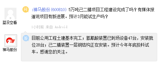 上证报中国证券网讯 神马股份2月15日在“上证e互动”平台表示,己二腈装置一层钢结构正在安装,预计今年年底投料试车。