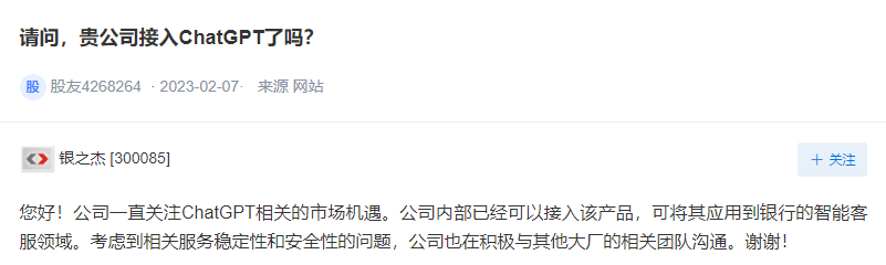 银之杰:公司内部已可接入ChatGPT相关产品 可将其应用到银行智能客服领域