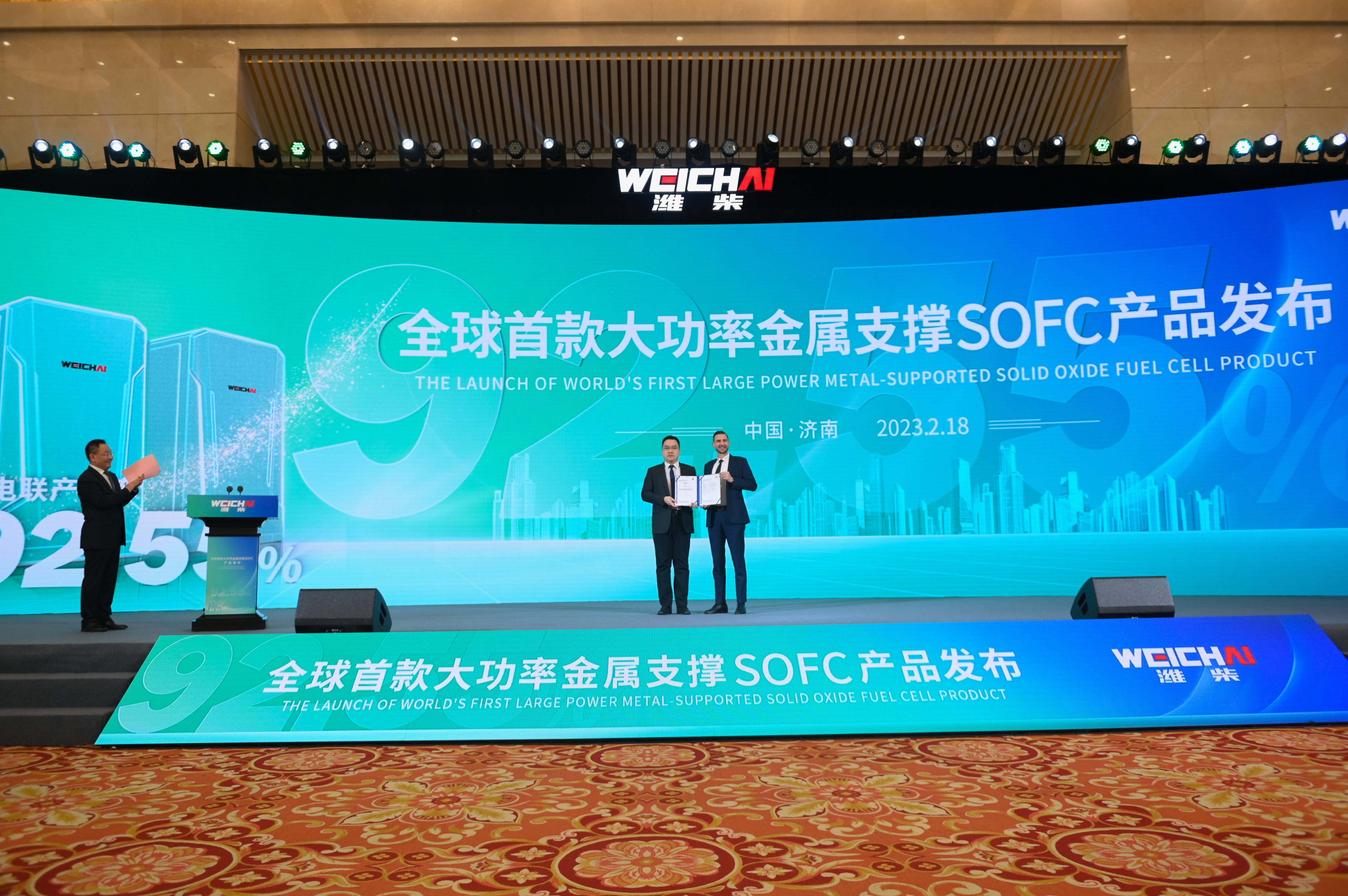 2023年2月18日,潍柴发布全球首款大功率金属支撑商业化SOFC(固体氧化物燃料电池)产品。该产品的热电联产效率高达92.55%,创下了大功率SOFC热电联产系统效率全球最高纪录。