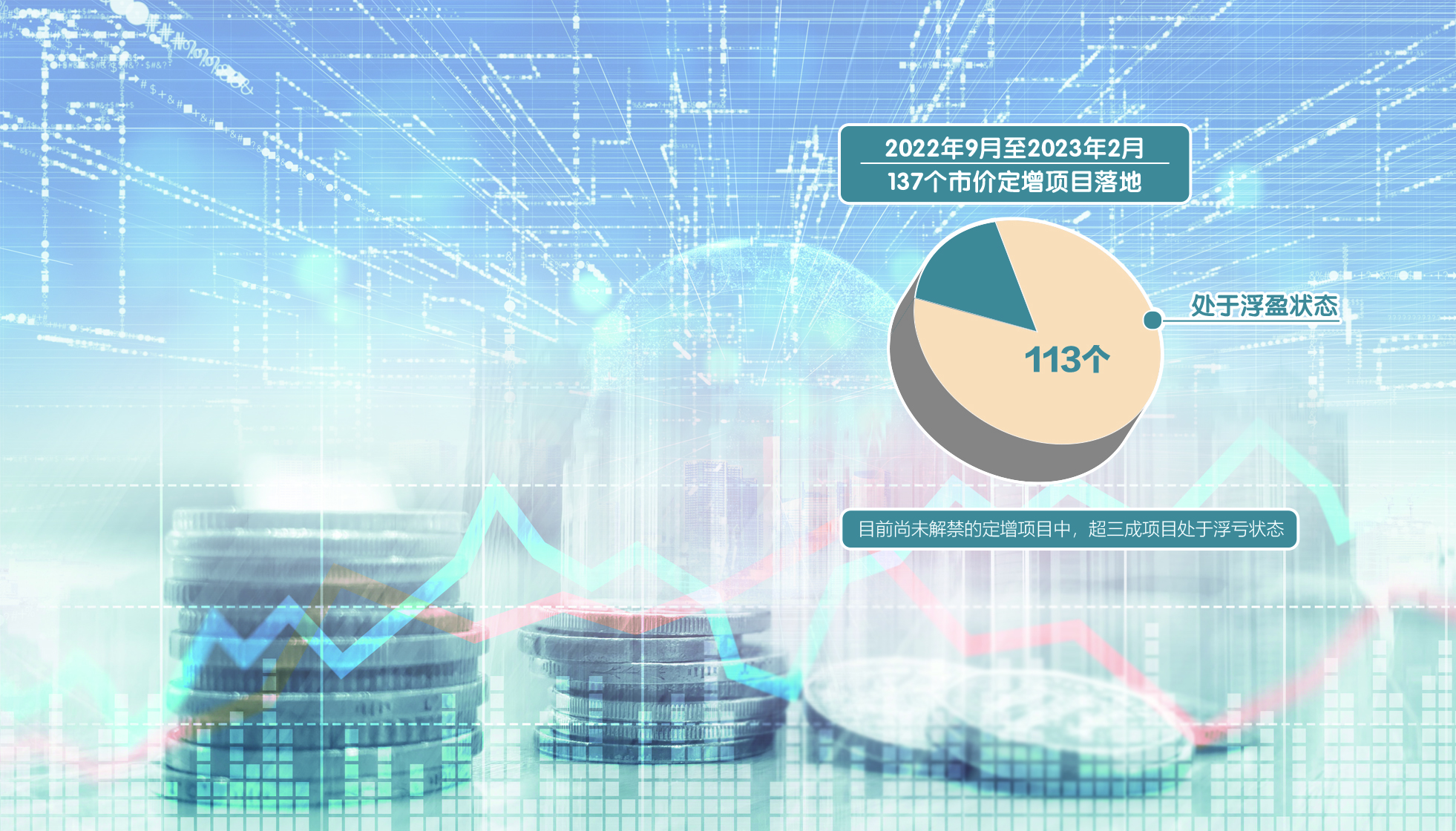 整体来看,尽管仍在限售期,但大部分定增项目已经有了不小的浮盈。东财Choice数据显示,以增发上市日为口径,2022年9月至2023年2月共有137个市价项目落地,其中113个项目目前处于浮盈状态;在锁价项目中,超六成项目目前处于浮盈状态。