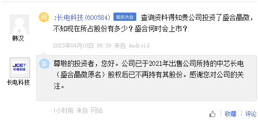 上证报中国证券网讯 长电科技4月19日在互动平台回答投资者提问时表示,公司已于2021年出售公司所持的中芯长电(盛合晶微原名)股权后已不再持有其股份。