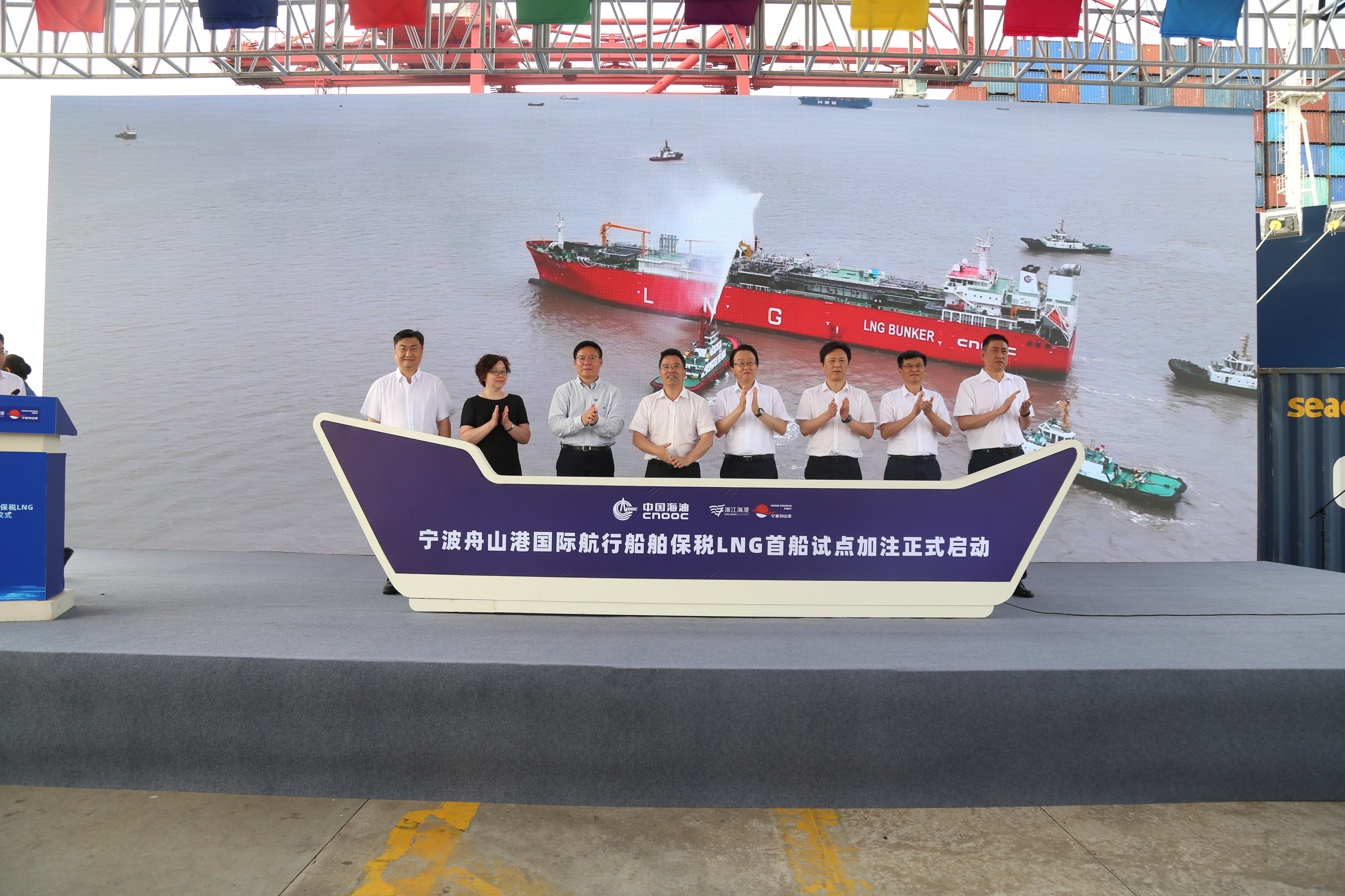 宁波市副市长李关定出席仪式,宣布首船试点加注正式启动,并与浙江省海港集团、宁波舟山港集团总经理陶成波,中国海油气电集团董事长石成刚、浙江海事局副局长杨卫强、宁波海关副关长梁丹虹、浙江省能源局巡视员季树忠、北仑区区长王程、宁波海事局副局长黄岩共同浇筑启动台。