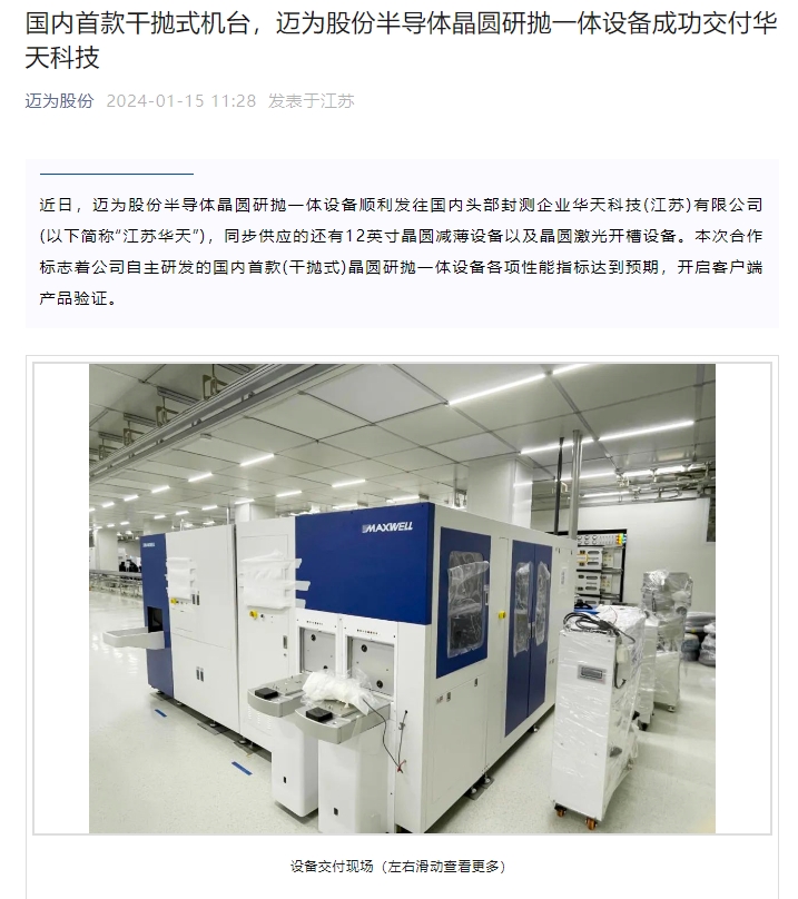 迈为股份半导体晶圆研抛一体设备成功交付华天科技