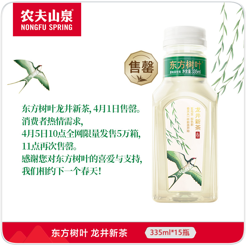 上证报中国证券网讯(记者 杨烨)再破纪录!4月5日上午10点,记者从农夫山泉处获悉,东方树叶第二批5万箱龙井新茶在各大电商平台上线,开卖1分钟便售出1万箱,1小时全部售罄。打破4月1日第一批5万箱17小时售罄的记录。